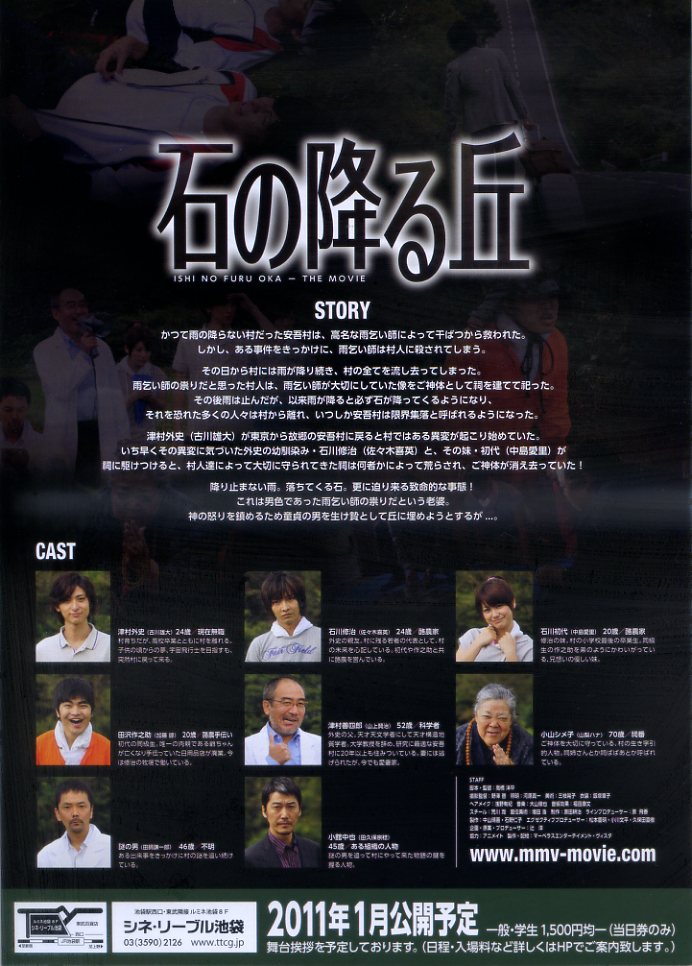 殺された高名な雨乞い師のたたりで雨が降ると必ず石も降ってくる安吾村。東京から故郷の安吾村に戻ってきた外史は、村人が建てた祠(ほこら)が荒らされご神体がなくなっていることに気がつく。そのせいか村は雨と石が降り止まない。男色だったという雨乞い師のたたりを鎮めるためには、童貞の男を生けにえとしてささげなければいけないというが…